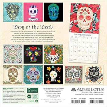 Day of the Dead sugar skulls appear on everything from apparel to jewelry and tattoos. The Day of the Dead: Sugar Skulls wall calendar features fantastic Día de los Muertos pop culture icons in stunning paintings, vector art, and screen-printed posters. This is a vibrant tribute to life and a living Mexican folk tradition. 12" x 12" wall calendar (12" x 24" open). A year of stunning sugar skull artwork on your wall. The perfect gift for Day of the Dead sugar skull art enthusiasts. Features intricate works of art by accomplished artists such as Jade Mosinski, Andrew Bannecker, Jesi Lee, Tino Rodriguez, and Lydia Hess. We Plant Trees — Amber Lotus Publishing, an independent carbon-negative US company, has planted more than three quarters of a million trees since 2008. High-quality printing on premium paper stock. Printed on paper sourced from a combination of sustainably managed forests and recycled materials. Features US and Canadian legal holidays, phases of the moon, and important observances of the world's major religions. Also available from Amber Lotus: Sugar Skulls 2020 Mini Wall Calendar: Day of the Dead and Sugar Skull 2019 On-the-Go Weekly Planner.