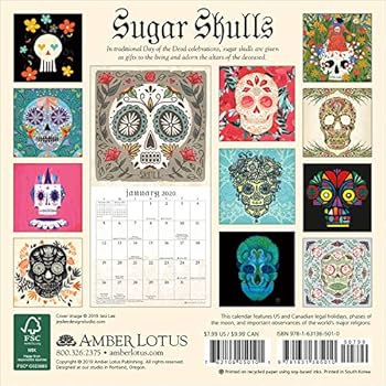 Day of the Dead sugar skulls appear on everything from apparel to jewelry and tattoos. The Sugar Skulls mini wall calendar features twelve fantastic Día de los Muertos pop culture icons in stunning paintings, vector art, and screen-printed posters. This is a vibrant tribute to life and a living Mexican folk tradition. 7" x 7" calendar (7" x 14" open) — an ideal size for your school locker, office, purse, or backpack. A year of stunning sugar skull artwork on your wall. The perfect gift for Day of the Dead sugar skull art enthusiasts. Features intricate works of art by accomplished artists such as Jade Mosinski, Andrew Bannecker, Jesi Lee, Tino Rodriguez, and Lydia Hess. We Plant Trees — Amber Lotus Publishing, an independent carbon-negative US company, has planted more than three quarters of a million trees since 2008. High-quality printing on premium paper stock. Printed on paper sourced from a combination of sustainably managed forests and recycled materials. Features US and Canadian legal holidays, phases of the moon, and important observances of the world's major religions. Also available from Amber Lotus: Day of the Dead 2020 Wall Calendar: Sugar Skulls and Sugar Skull 2019 - 2020 On-the-Go Weekly Planner.